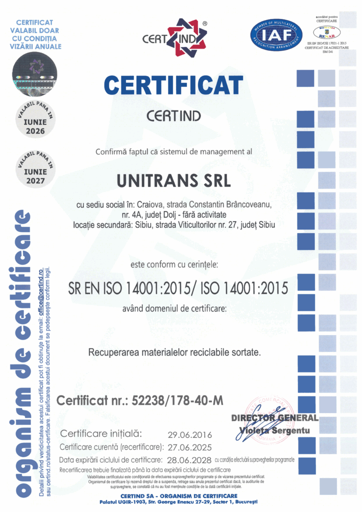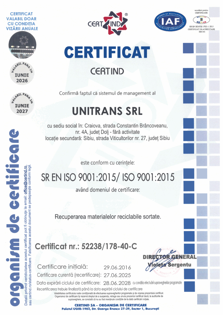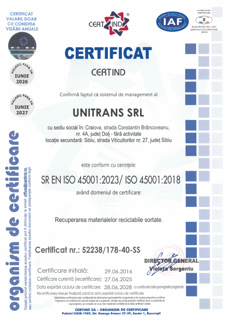 Înființată în 2003, Unitrans SRL se bazează pe o echipă de 30+ specialiști, inclusiv 8 șoferi profesioniști. Asigurăm procese eficiente, sigure și conforme, de la colectare până la valorificarea deșeurilor.